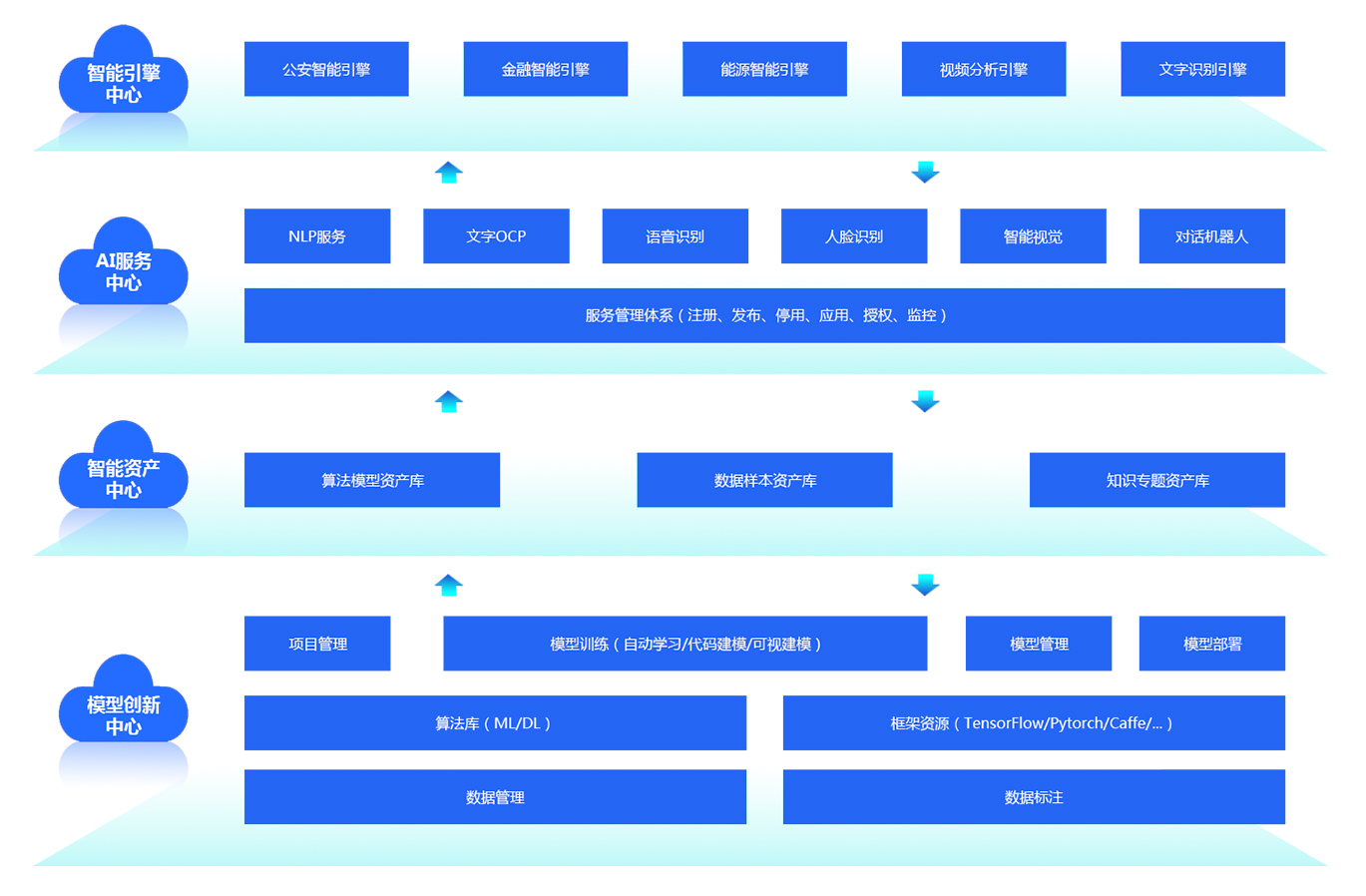 连通客户组织内部AI应用孤岛,充分利用已有AI能力,并进行沉淀、更新,支撑各业务部门快速使用,避免重复建设、无训练数据优化模型等问题。