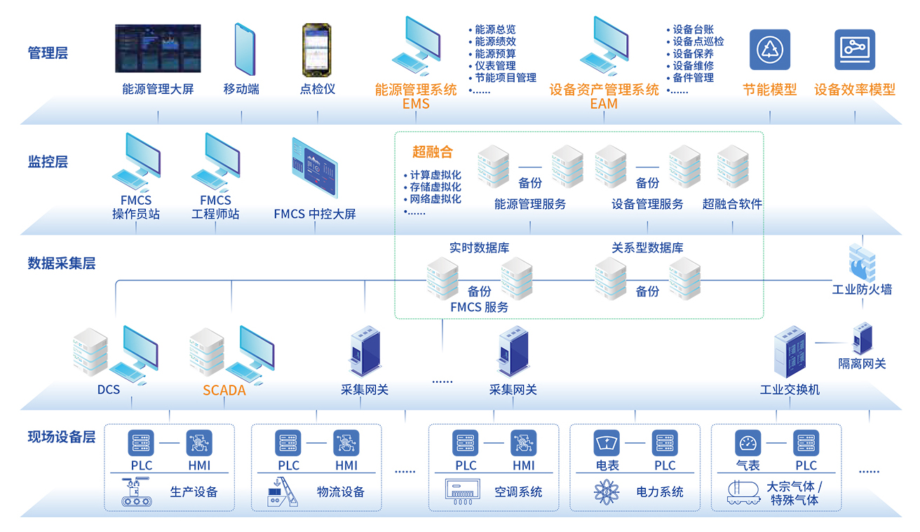 ● 底层工业现场控制 - 厂务调度 - 能源管理 - 设施运维的全面融合,实现安全高效的数据交互,满足各种工业信息化企业需求。