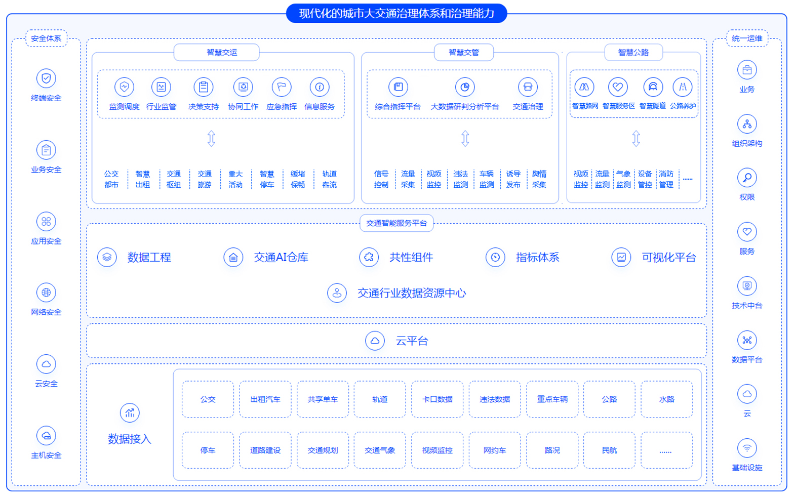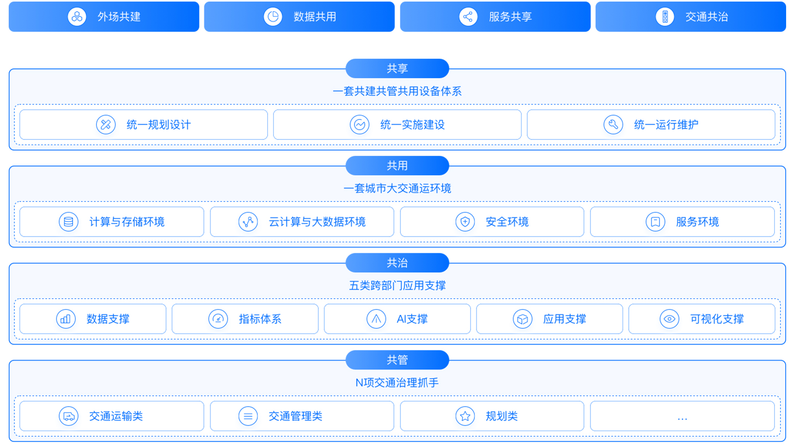 以现代数字城市底座能力为基础,通过自主创新、外部引智,构建集聚融合、开放共享、互联互通的数字交通管理服务体系,形成数字化采集体系和网络化传输体系,提升城市“大交通”数据治理、业务协同、智慧应用水平。