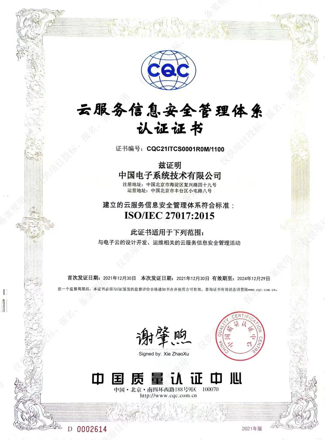 ISO27017云服务信息安全管理体系认证证书