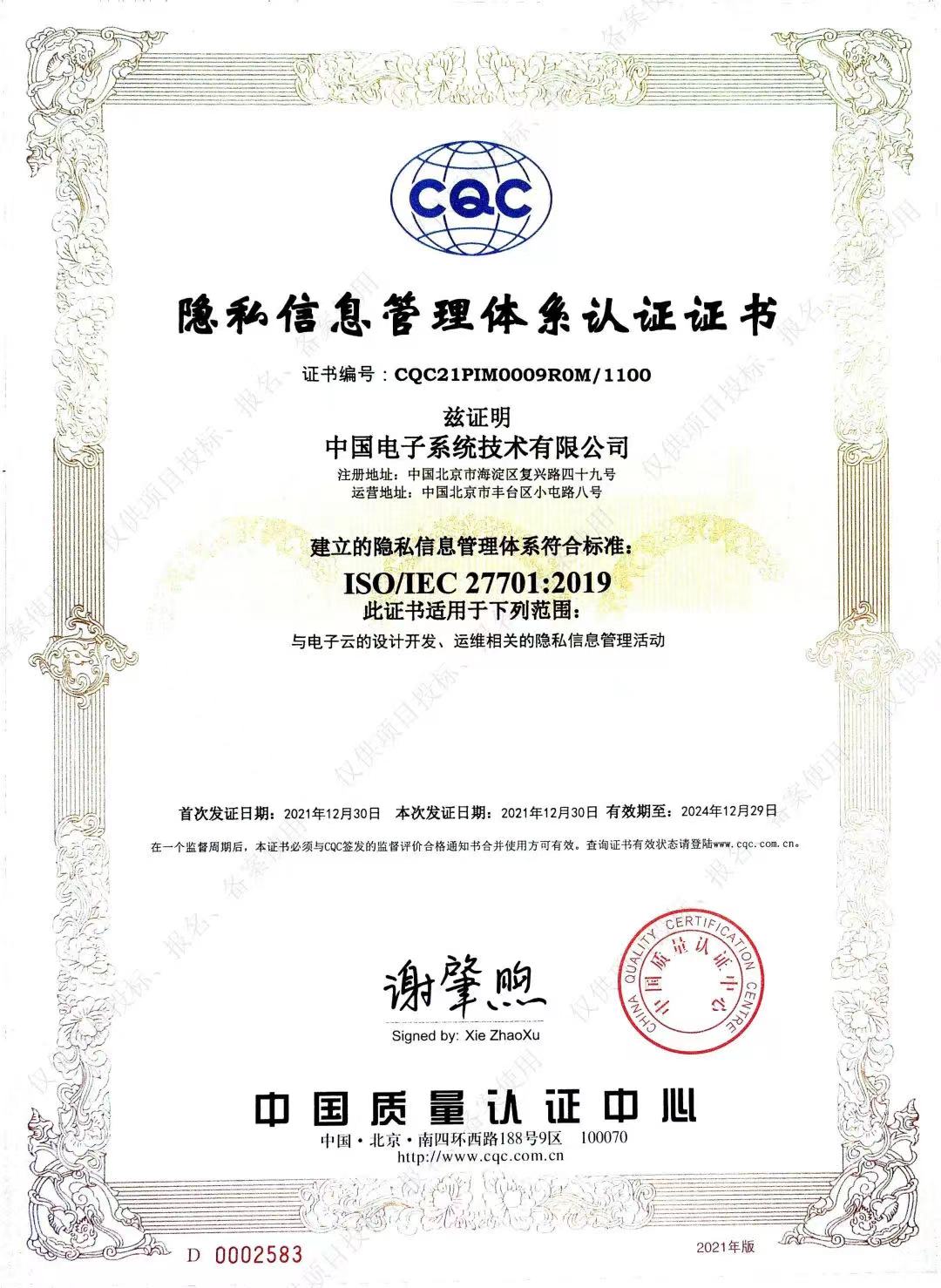 ISO27701隐私信息管理体系认证证书