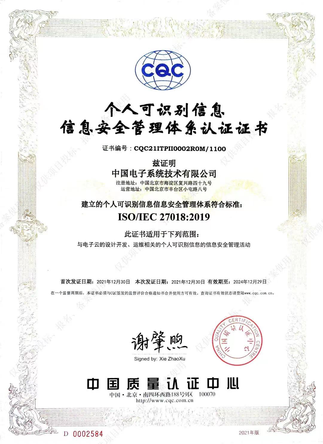 ISO27018个人可识别信息安全管理体系认证证书