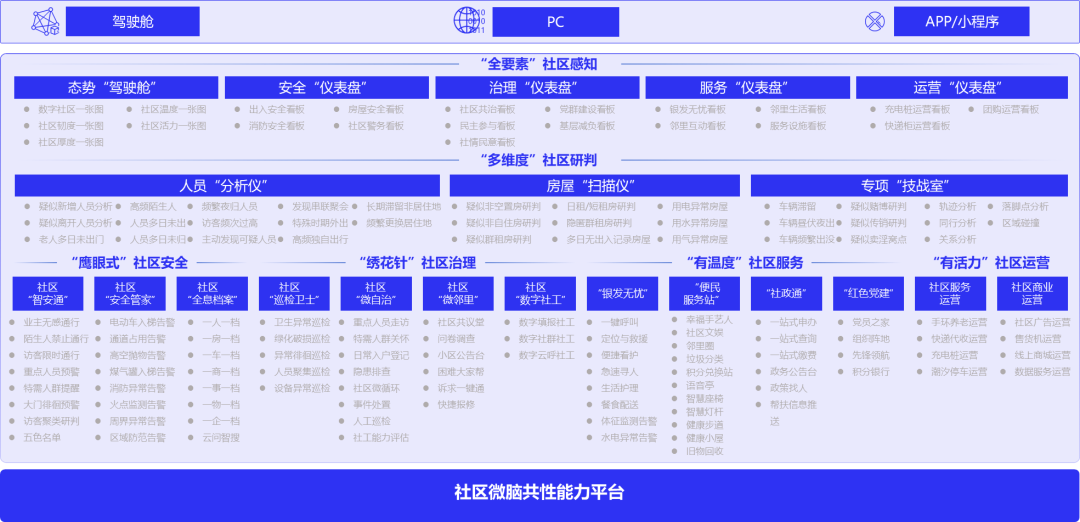 1个社区微脑共性能力平台。包括社区物联接入平台、社区视频融合平台、社区智能引擎、社区数据金库和社区管理能力平台,为社区微脑业务的实现提供“数+智”的技术支撑,赋能社区场景应用。