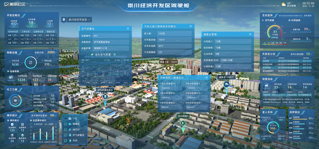 作为社区的居民,先进的智能设备提升了人们享受生活的品质,让生活更加便捷,居民更加安心。而作为社区管理者,也可以通过智慧社区系统中的可视化大屏随时点击小区内的数据,对小区内的危险情况提前做出预警。