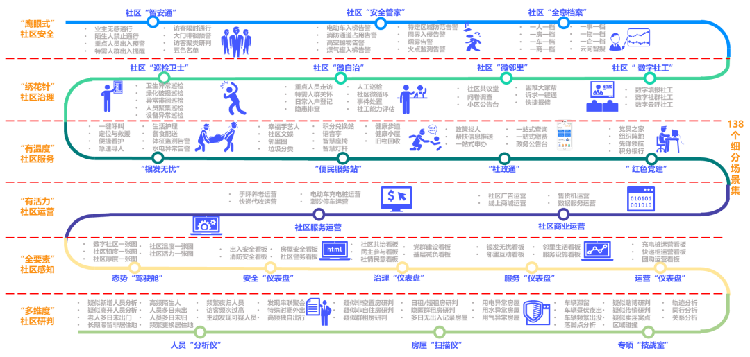 社区微脑解决方案共计覆盖6大场景域、21大场景类及138个细分场景