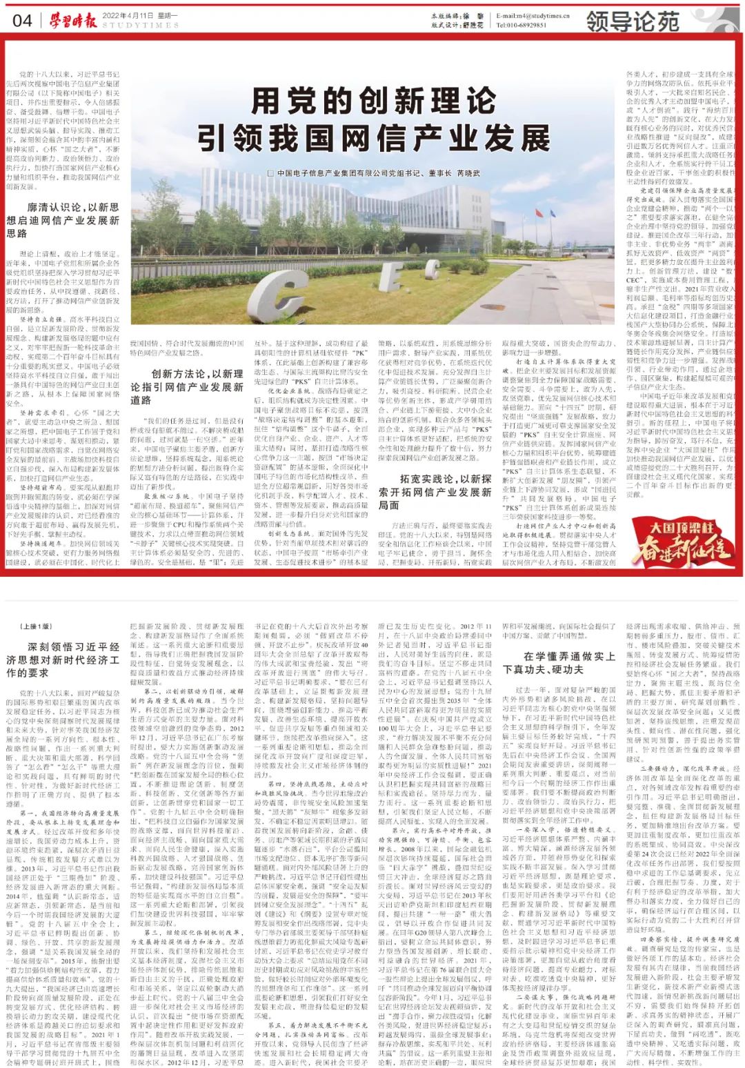 4月11日,中共中央党校(国家行政学院)主管主办的《学习时报》刊发ky开元电子党组书记、董事长芮晓武的署名文章《用党的创新理论引领我国网信产业发展》。全文分享如下——