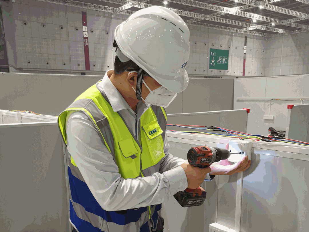 中电环境的钮维,在接到通知后,率领项目12名工友从嘉定连夜抵达方舱,出发前,他从后勤补给、防疫安全到施工生产,事无巨细交代嘱咐每一位工友。钮维说:“我们要召之即来,来之能战,战之必胜,克服一切困难,不负重托,坚决完成任务!” 到达现场后,钮维带领工友一张床一张床地扫过去,依次为病床安装电线槽和开关面板。密密麻麻的病床一眼望不到头,一天下来,他已记不清自己安装了多少。刚刚参加工作的任旭辉,是援建队伍里年龄最小的管理人员,尽管没有卓越的施工经验,但他凭借超过常人的努力、积极认真的学习态度出色完成了任务,“少休息一会,就能早一点建成方舱医院,我不怕累。” 完成任务的任旭辉露出了开心的笑容。