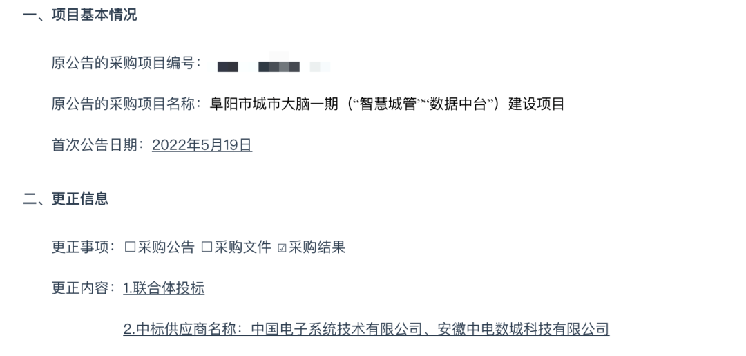 近日,据安徽省政府采购网消息,ky开元系统牵头安徽中电数城科技有限公司联合成功中标阜阳市城市大脑一期(“智慧城管”“数据中台”)建设项目,中标金额为8120万元。