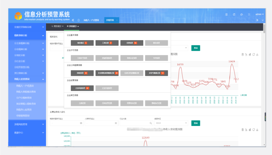 围绕重点骨干企业、重点行业、产业“链主”企业,利用机器学习算法动态生成行业产业链知识图谱,一图呈现企业财税贡献、产业链条情况,多维度分析产业链上企业的土地、交通、水、电、人力资源和税费的综合成本,分析本地链上企业的政府采购、财政扶持力度、产业税收贡献比例及比对中部和全国平均水平情况。综合查找比对全国同类型企业的成本、优势,运用数据模型预测补链后,企业财税贡献,预测产业财税贡献与批发零售、交通运输、建筑、金融行业财税贡献比值趋势,为优化产业结构空间布局,形成合理的产业梯度进行科学研判分析。