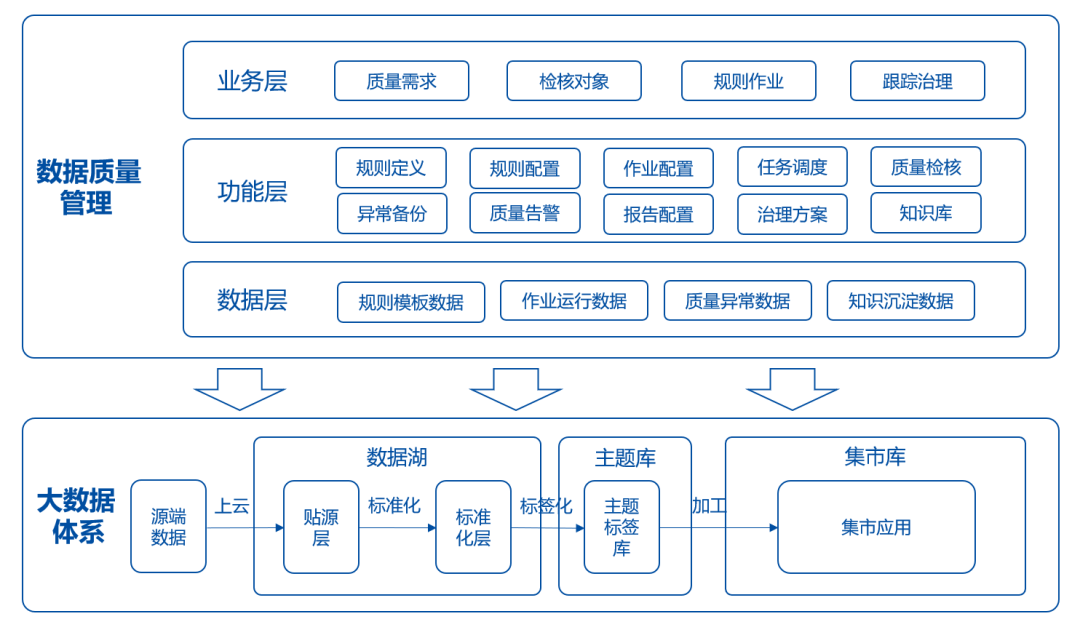 数据质量管理是在大数据平台上,独立对任意库、表、字段、大数据分区进行差异化质量检核,对数据全生命周期的管理和监控,自下向上包含存储层、应用层和业务层。