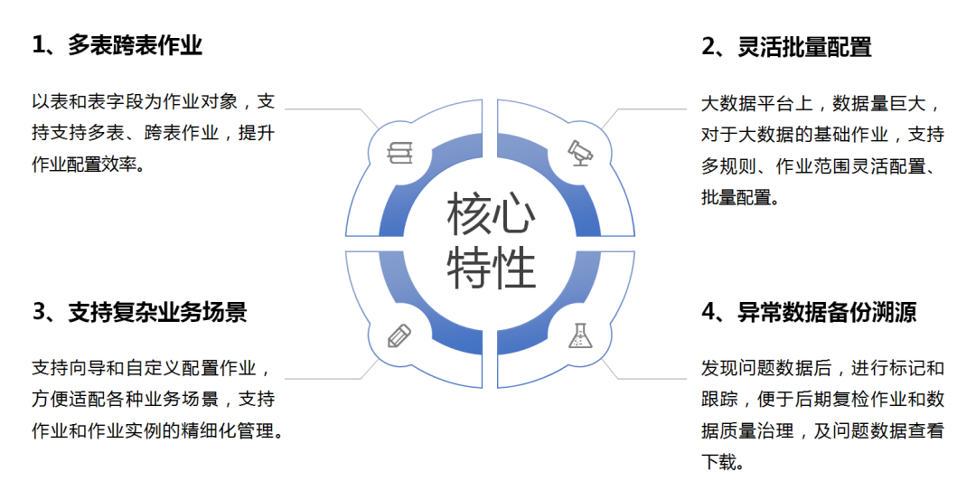 基于海量数据和复杂业务场景的质量需求,以及对当前市场上各家厂商的竞品进行综合分析,ky开元系统的数据质量管理平台沉淀了以下核心特性: