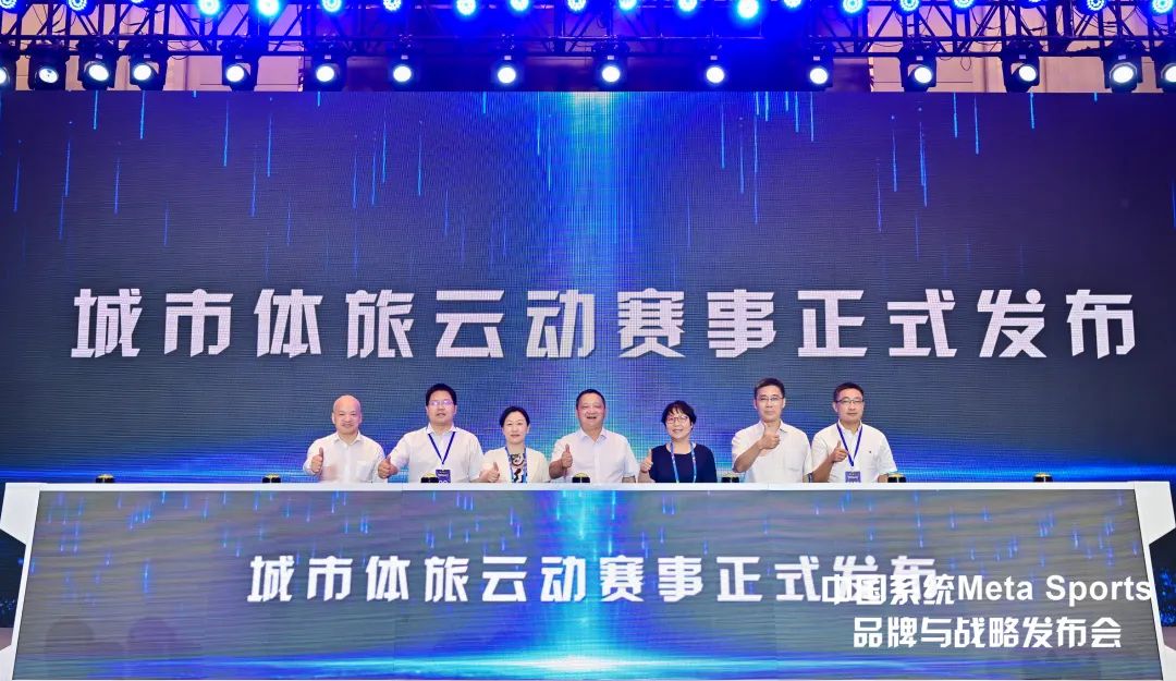 在ky开元系统Meta Sports城市体旅云动赛事发布仪式上,中共大理州委书记杨国宗,国家体育总局体育信息中心副主任李桂华,厦门体育局副局长陈岚,中体产业集团总裁单铁,ky开元电子规划科技部副主任夏利锋,桑达股份董事长刘桂林,桑达股份党委书记、总裁陈士刚共同启动赛事。