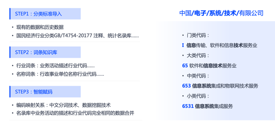 对现有统计业务收集到的企业数据,利用特征工程、深度学习模型等自然语言处理技术,参考行业分类名录库,将企业自动智能赋码,对企业所在行业门类、大类、中类、小类进行单分类和多分类。