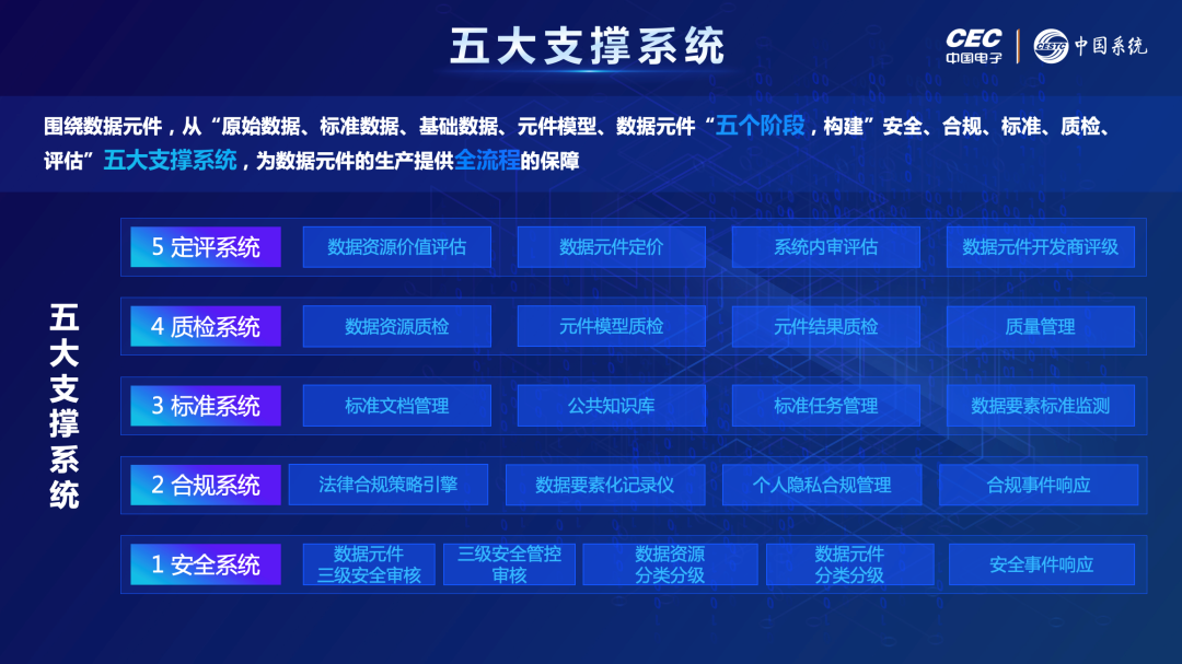 5:五大支撑系统,包括安全、合规、标准、质检、定价评估系统,是解决数据产权、流通交易、收益分配、安全治理等难题的算法和策略中心,为数据元件的加工流通提供全流程的保障;