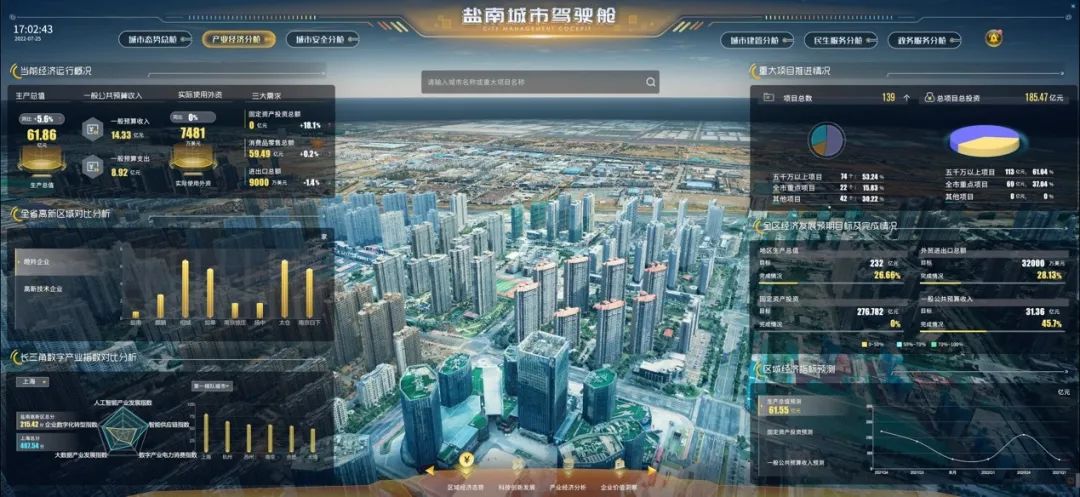 目前,盐南城市驾驶舱已完成数字底座ky开元电子云环境搭建、数据中台部署、数据信息资源共享交换平台建设;通过36家单位调研与对接,汇聚全区32万人口数据,梳理三十多类、二百多项标签,接入业务系统49个、表1044张、文件类385项、数据接口299个,数据量7642万条;共建设五大主题库,产业经济主题库分别接入长三角城市群1335条数字经济产业政策数据和全区28000多家企业数据;已打通视频类系统7个,包括公安、城管、教育、物业等共20472路视频。