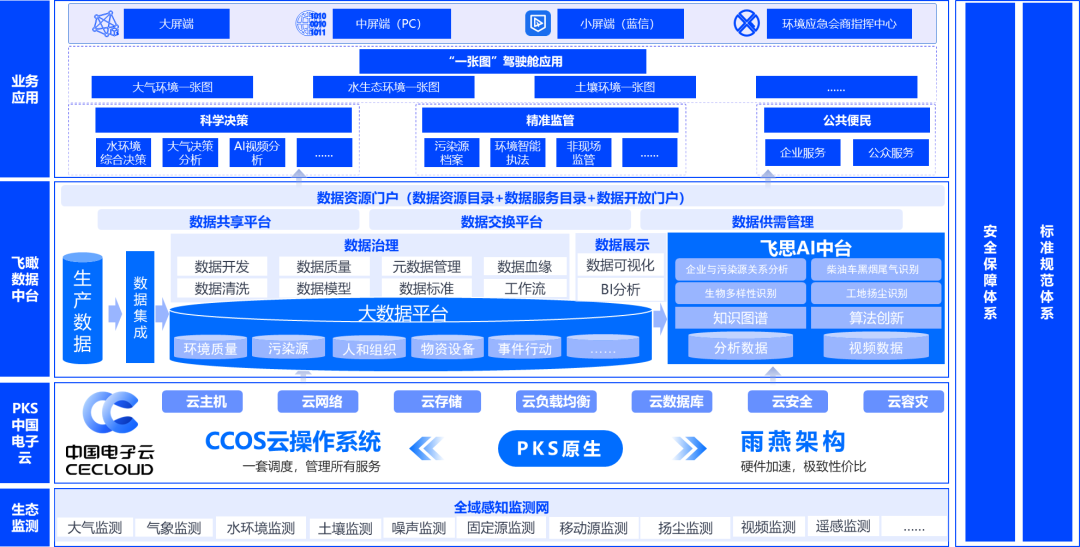 ky开元电子云专属云平台CECSTACK基于新一代ky开元电子云自主研发的“雨燕”架构与云原生操作系统CCOS,融合先进的云原生架构理念,实现计算、存储、网络资源的统一云原生分布式调度与协同,为生态环境业务提供安全、稳定、可靠的支撑。