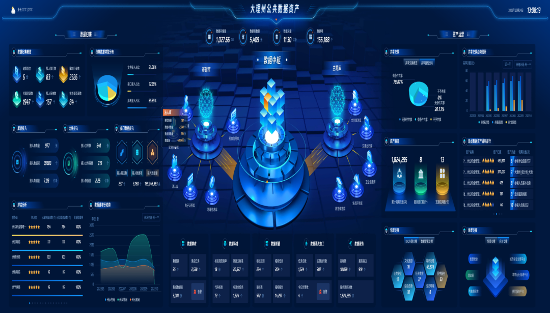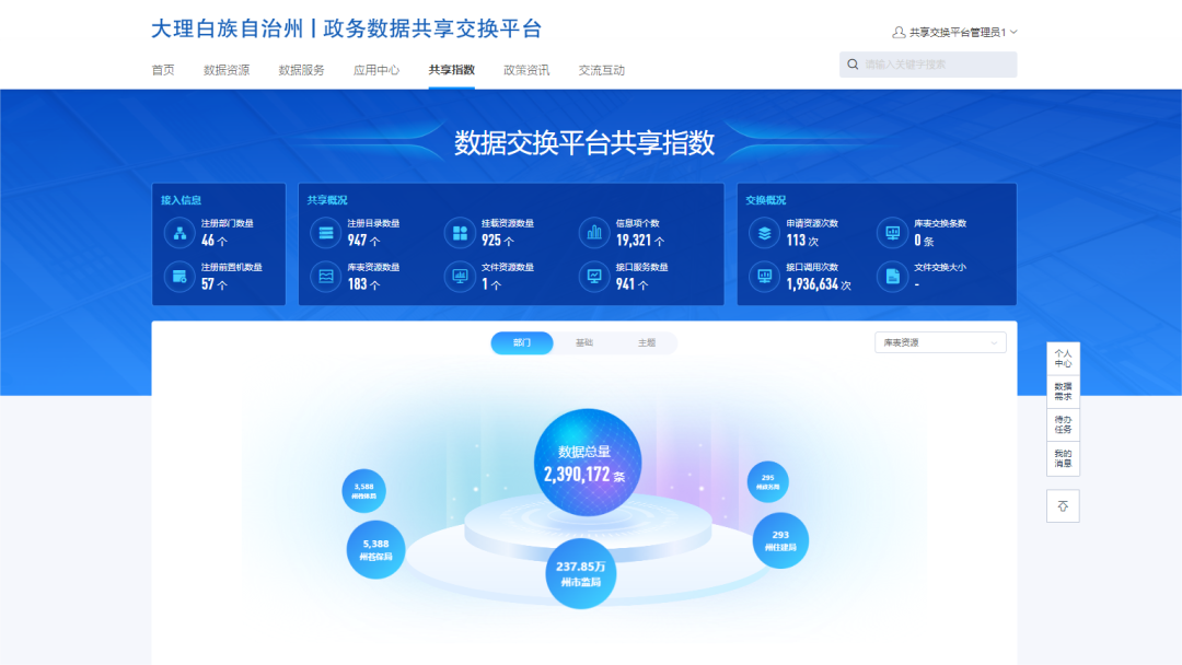 大理州数据中枢由数字大理公司建设运营,依托苍洱云,为大理州提供安全数据的相关服务,截止当前,已归集共计2230G(非结构化图层数据2032G,结构化数据198G)、约10.8亿条数据。其中,完成州级91家单位的数据普查工作,归集了大理州住房公积金管理中心、大理州不动产登记中心和市场监督管理局等83家的单位数据;完成大理市65家单位数据普查工作,归集了37家单位的数据;完成大理经济技术开发区18家单位数据普查工作,归集了14家单位的数据,并同步开展了弥渡县、祥云县和鹤庆县等县市数据归集工作。数据中枢不仅为大理州提供数据采集、数据治理、数仓开发等服务,还通过汇聚全州数据,打通数据壁垒,为纵向(省州县)横向(同级委办局之间)提供数据共享交换,为各类智慧应用提供数据支撑,同时为大理州开展数据要素市场化流通体系(数据交易),打造高价值的数据资源。