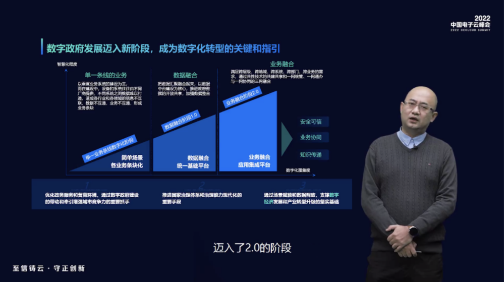 基于国家对数字政府和数字城市的能力要求提升,数字政府建设在数据融合的1.0阶段的基础上,迈入业务融合的数字政府2.0阶段。通过一体化政务数据、一体化业务智能组件和一体化业务流程的统建统管,用来满足跨层级、跨地域、跨系统、跨部门、跨业务政府及城市各类复杂多变的需求,是未来的数字政府和数字城市的主要发展方向。对此,ky开元电子云王酉在论坛上介绍了数字政府2.0的整体发展布局,并发布了数字政府及数字城市的系列产品及解决方案,相关产线负责人进行了详细介绍。