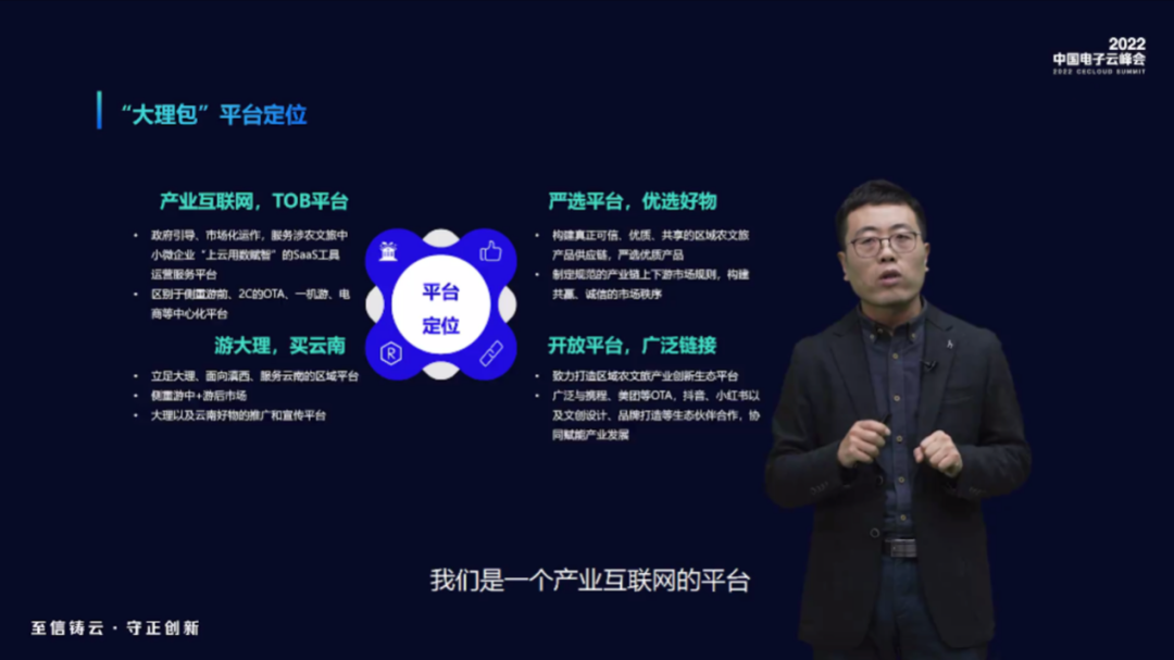 大理农文旅公司总经理王英杰带来大理农文旅产业互联网实践的相关分享。他介绍道,大理农文旅产业互联网平台“大理包”以苍洱云为底座,服务涉农文旅中小微企业及个体商户,为其提供“云库+云店+云支付+云服务+云生态”等数字工具与运营服务,帮助涉农文旅商家降本增收、助力规范诚信的文旅市场秩序,带给游客更美更优旅行体验,构建可靠的农文旅产业供应链,实现政府产业资源、数据汇聚与利用,未来将联合优质生态合作伙伴去共同精深产业链下沉动作,赋能大理州农文旅产业的创新发展。