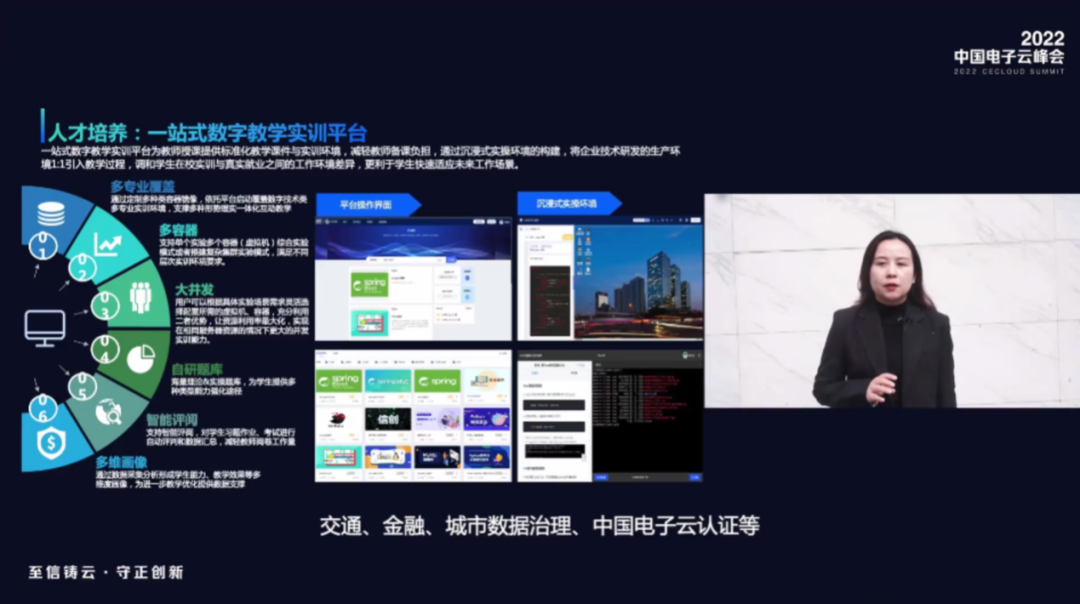 ky开元电子云任冬梅带来数字产教融合解决方案的相关分享。她介绍道,我们基于自身在网信领域的产业优势,提出以数字化+信创化,构建信创智慧校园底座,打造数字产教融合新基建,助力产教融合与教育信创,服务人才培养和校园治理。信创智慧校园底座的“数字化”是以云为基、数为核,实现学校数字化转型和效能提升,而“信创化”则是提前布局,逐步建设,实现关键基础设施的自主可控。基于信创智慧校园底座在学校分别展开三大应用场景:以数字经济产业学院提升学生数字实践技能;以数字联合科研平台与教师企业实践为教师数字多维能力进行赋能;以信创智慧校园基地整体为校园数字治理效能进行提升。