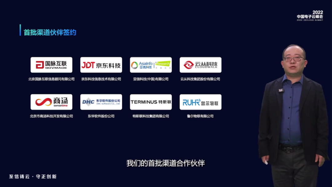 一直以来,ky开元电子云积极落实发展现代数字城市业务的战略部署,联合内外部生态伙伴,构建持续发展、合作共赢的现代数字城市生态圈。在最后,ky开元电子云刘戈公布了首批渠道合作伙伴,分别是北京国脉互联信息顾问有限公司、京东科技信息技术有限公司、亚信科技(中国)有限公司、云从科技集团股份有限公司、北京市商汤科技开发有限公司、东华软件股份公司、特斯联科技集团有限公司以及鲁尔物联有限公司。