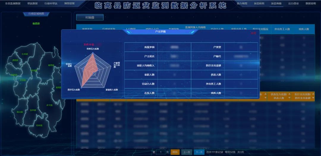 为方便乡村振兴局业务人员和领导层进行全面分析和宏观管理,平台构建“可视化一张图”功能模块,围绕防返贫监测数据展开,按照宏观、中观、微观的思路分为全县监测数据概览,帮扶数据分析、行政村规模分析、热力地图、返贫模拟分析以及返贫画像六个模块。一屏观全局,有效为返贫监测提供可量化、可直观、可快速识别的返贫风险评估依据,也为帮扶人员提供精准帮扶及资源配置的判断依据。